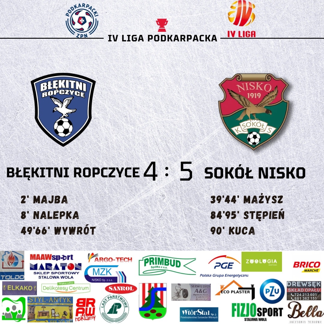 Mecz był prawdziwą karuzelą emocji, Gospodarze szybko objęli prowadzenie w 2′ i 8′ minucie, Sokół nie był bezradny bo w 25′ i 44′ doprowadził do remisu. W 49′ i 66′ Kacper Wywrót dał prowadzenie Błękitnym w 85′ Jacek Stępień zmniejszył różnice na 4-3, w 90′ Kuca wyrównał 4-4 a w doliczonym czasie zwycięstwo zapewnił kapitan Jacek Stępień!